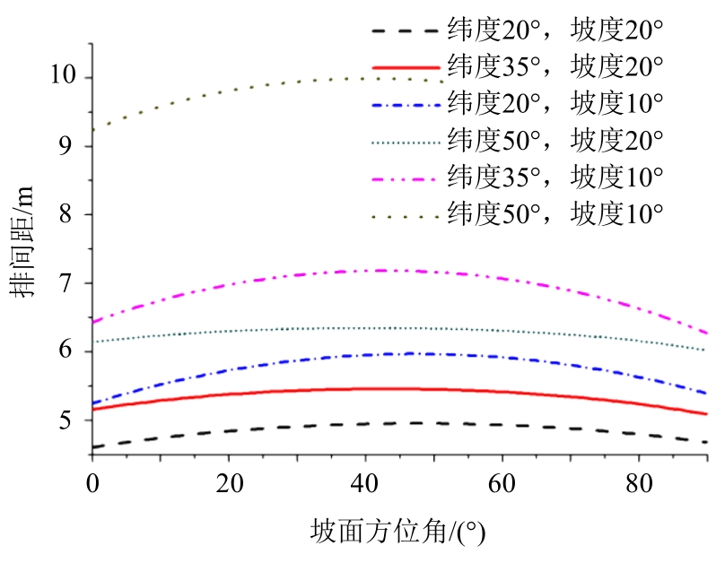 | 图5 不同纬度、坡度下排间距随坡面方位角的变化曲线(随坡倾角布置) |