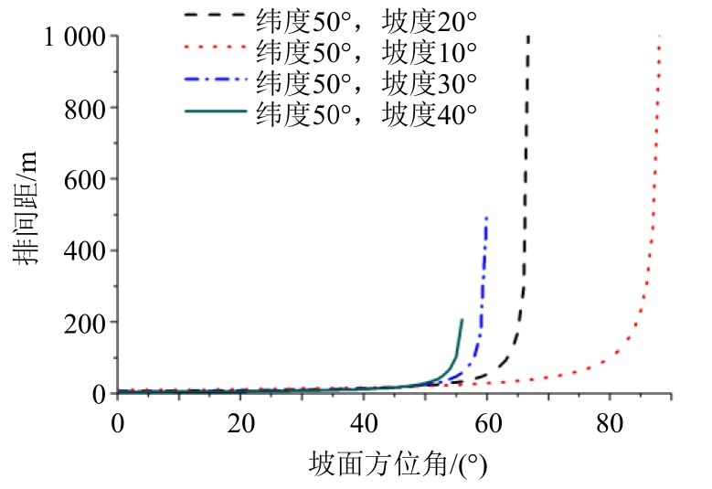 高纬度、不同坡度下排间距随坡面方位角的变化曲线