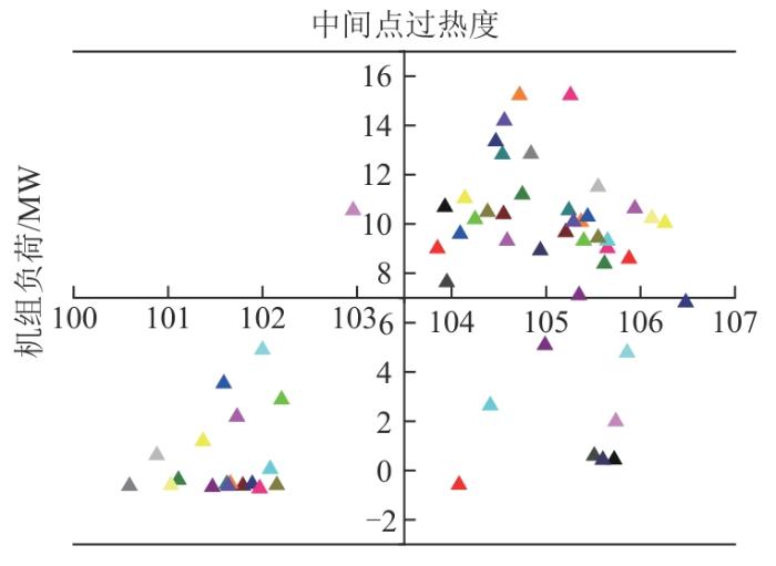 图5为分离器出口(中间点)过热度情况,实际运行中低负荷100.5~103.6 MW工况出现个别过热度接近0的分布,因此深度调峰工况下可能影响中间点过热度的水煤比、燃烧率等参数,在运行控制时需要重点关注。