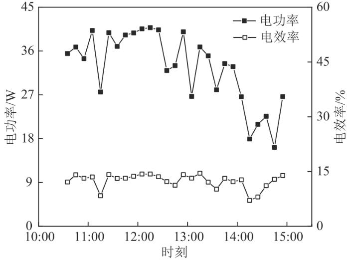 图6为轻薄型PV/T的光伏组件的电功率和电效率随时间的变化。光伏电池的输出功率、输出效率和太阳辐照度的变化一致,输出功率的变化幅度大于输出效率的变化幅度。