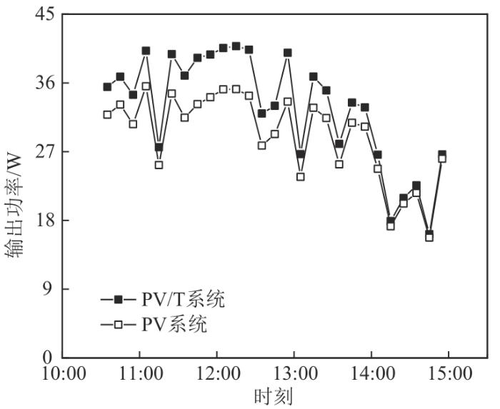 轻薄型PV/T系统和PV系统的光伏组件温度变化如图8所示,结果表明,PV/T系统光伏组件温度比PV系统电池温度低2~10 ℃,且差值随着太阳辐照度的变化而变化。11:30—12:00,太阳辐照度达到最大值,2个结构的光伏组件的温差也达到最大值10 ℃,而后太阳辐照度降低,温差也随之减小。