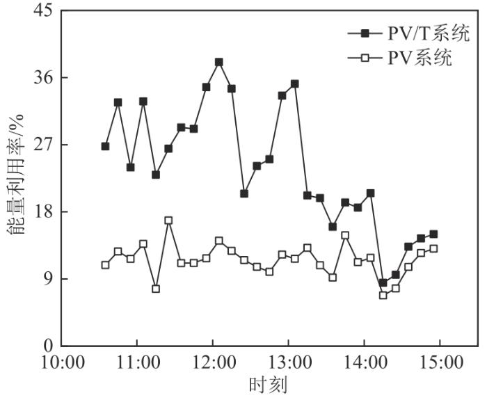 轻薄型PV/T系统和PV系统的能量利用率如图10所示,可以看出,轻薄型PV/T系统的能量利用率比PV系统的能量利用率更高,二者的能量利用率差值随太阳辐照度、光伏组件温度的增加而增大,在12:00达到最大值23.94%,在14:05降低至最小值1.70%。而后太阳辐照度上升,二者的能量利用率均升高,由于此时太阳入射角较大,所以能量利用率处在较低的范围。