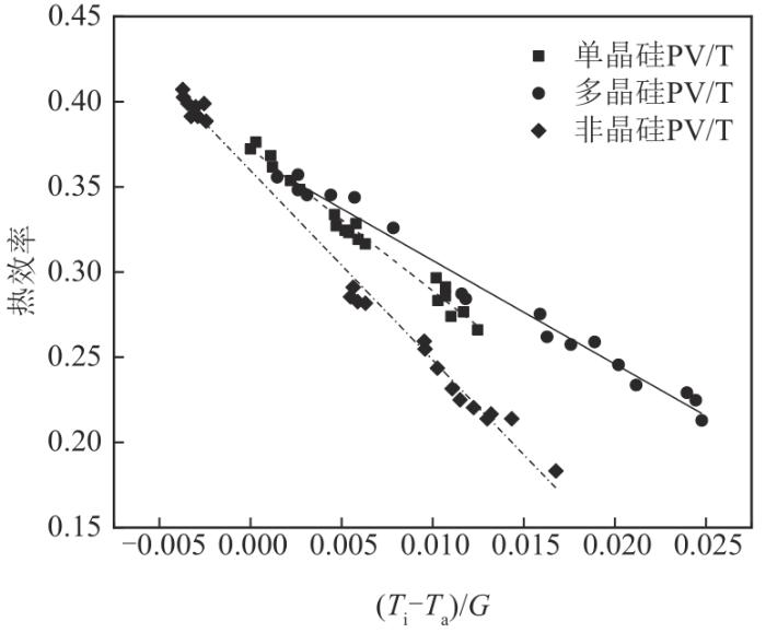 本文所研究的PV/T的瞬时热效率归一化公式为n=0.213-11.99×(Ti-Ta)/G,Ta为环境温度,截距效率比以上3种PV/T的截距效率低,而斜率和此公司非晶硅PV/T的斜率相当,说明二者的热损失系数相当。