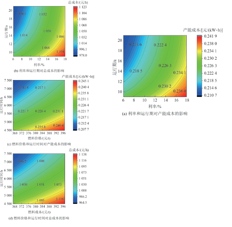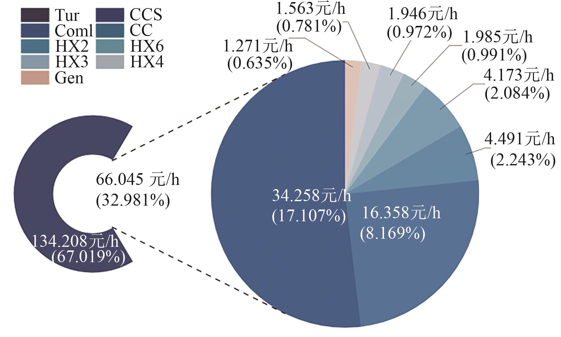 目的 在“双碳”战略与全球能源结构转型背景下,如何实现传统能源系统的高效低碳化运行是当前亟需突破的难题。为此,构建了一种耦合热泵(heat pump,HP)技术的低碳排冷热电联供(combined cooling, heating, and power,CCHP)系统。 方法 通过多级余热回收与温区协同匹配机制,优化能量梯级利用路径;建立涵盖热力学、环境友好性、经济及㶲经济性能的多维度评价模型,并与传统系统性能进行了对比。 结果 经济性分析结果显示,HP的引入使单位产电成本从1.24元/(kW⋅h)增至1.43元/(kW⋅h),但单位产能成本从0.24元/(kW⋅h)降至0.22元/(kW⋅h),综合能效提升;灵敏度分析结果显示,运行时间与利率对成本影响最大;㶲经济分析表明,透平、碳捕集与封存(carbon capture and storage,CCS)系统和压缩机分别贡献67.019%、17.107%和8.169%的㶲损失,是未来优化的核心方向。 结论 研究成果为低碳排CCHP系统的设计与推广提供了理论支撑。
