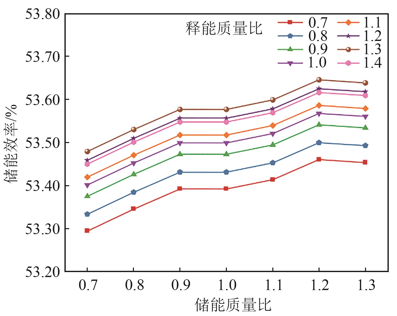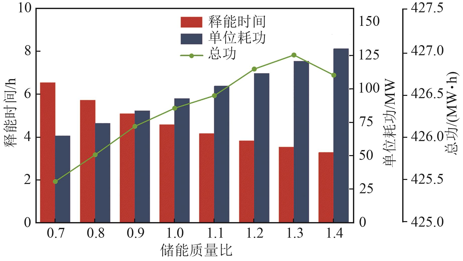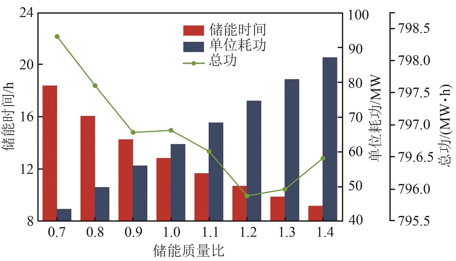 | 储能比 | 质量流量/(kg/s) | 储能时间/h | 最终温度/K | 单位耗功/(kJ/s) | 总功/(MW⋅h) |