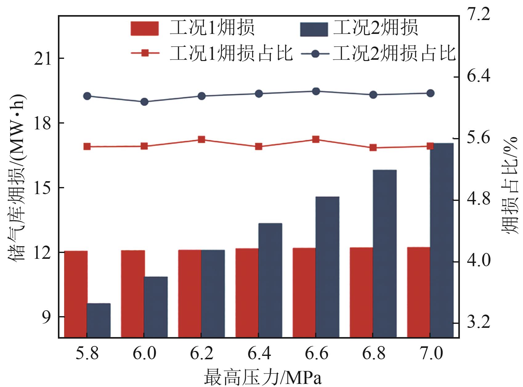 目的 为了有效提升压缩空气储能(compressed air energy storage,CAES)系统的储能特性和系统效率,对各部件的性能及其耦合特性进行了建模分析。 方法 针对CAES系统,应用标准热阻方法考虑换热部件的传递特性,结合储气装置与做功部件模型,构建传热、储气、做功耦合的完整热力学模型及能量、㶲分析模型,评价了压缩和膨胀过程中储(释)能质量流量比对系统性能的影响。揭示储气库最高储气压力与体积之间的关系对系统储能效率及储能密度的影响规律。 结果 随着储(释)能质量流量比的增加,压缩机的总能耗先降低后升高,膨胀机的输出功是先上升后降低,当储(释)能的质量比分别为1.2和1.3时,系统效率达到最高,为53.65%;另外,系统中首级压缩和膨胀机的㶲损最大,油-气换热器和压缩机的㶲损占系统总㶲损的69%。 结论 所建模型和研究结果对CAES运行策略具有一定的指导意义。
