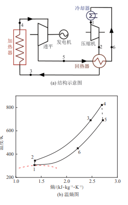 图1 简单回热循环结构及温熵图1—压缩机进口;2—回热器低温高压工质进口;3—加热器进口;4—透平进口;5—回热器高温低压工质进口;6—冷却器进口。