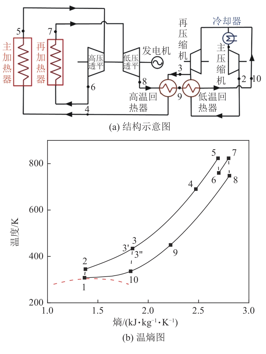 图3 再压缩超临界布雷顿循环结构及温熵图1—主压缩机进口;2—低温回热器低温高压流体进口;3—高温回热器低温高压流体进口;4—主加热器进口;5—高压透平进口;6—再加热器进口;7—低压透平进口;8—高温回热器高温低压流体进口;9—低温回热器高温低压流体进口;10—冷却器进口。
