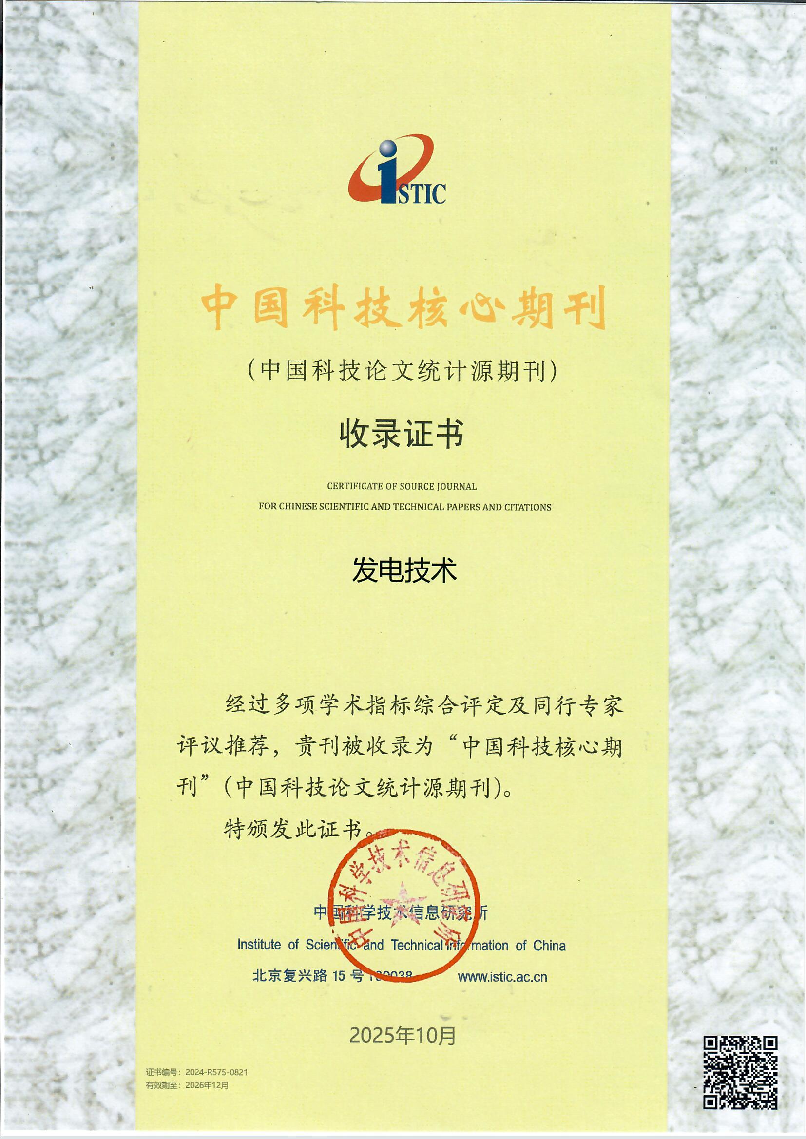 近日,中国科学技术信息研究所在北京召开“2025年中国科技论文统计结果发布会”,会议正式公布了《2025年中国科技核心期刊目录》,《发电技术》连续5年(2021—2025年)入选中国科技核心期刊。