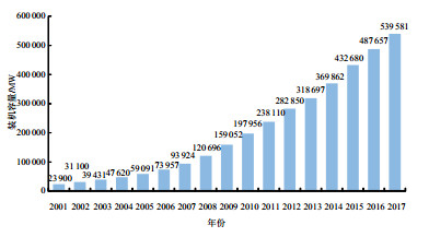当今世界资源短缺、环境污染日趋严重,节能减排势在必行,风力发电正日益受到全球各国的重视。据《全球风电市场2017年度统计报告》显示,2017年全球风电市场新增装机超过52.573 GW,至此全球累计装机容量达到539.581 GW,遍布100多个国家和地区。2001—2017年全球风电累计装机容量如图1所示。