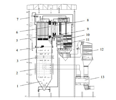 1—冷灰斗;2—旋流煤粉燃烧器;3—燃尽风燃烧器;4—中间集箱;5—屏式过热器;6—高温过热器;7—汽水分离器;8—高温再热器;9—低温再热器;10—低温过热器;11—省煤器;12—脱硝SCR装置;13—预热器。