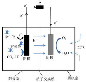 ... id="C4">微生物燃料电池是利用微生物将碳水化合物中的化学能转化为电能的装置.双室MFC主要由阳极区、阴极区和中间由质子交换膜(proton exchange membrane,PEM)组成,如图1所示.单室MFC有简单的阳极室,没有确定的阴极室,并且不含有质子交换膜.多孔阴极利用氧气从阴极室的一侧形成,使质子扩散.它们比双室燃料电池结构简单.原理都是:在阳极区,微生物生长代谢,通过呼吸作用将有机底物氧化并释放电子和质子.释放的电子在微生物作用下通过电子传递介质转移到阳极表面,并通过连接阳极与阴极的外导线输送至阴极,释放的质子到达阴极区,在阴极区,氧气得到电子反应生成水,这样就形成电子回路,最终输出电能.随着阳极区有机物的不断氧化和阴极反应的持续进行,在外电路持续产生电流.MFC就是利用阳极的微生物进行生物催化氧化的过程,酶、辅酶、电子传递体等共同参与[8].以葡萄糖作为底物的燃料电池为例,其阴阳极化学反应式如下: ...