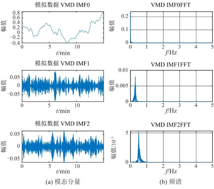 ... VMD是Dragomiretskiy提出的非递归信号分解方法,实质是变分问题,根据预设模态分量个数对信号进行分解[26 ] .该方法通过一个自适应维纳滤波器组将原始信号f (x )分解为K 个中心频率为ωk 的模态函数uk ,其中K 为预设模态分量个数.VMD算法在抗噪声和非平稳信号处理方面具有较好的性能和较高的运算效率,可以分解出直流分量. ...