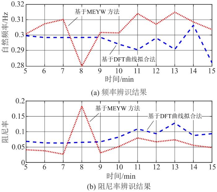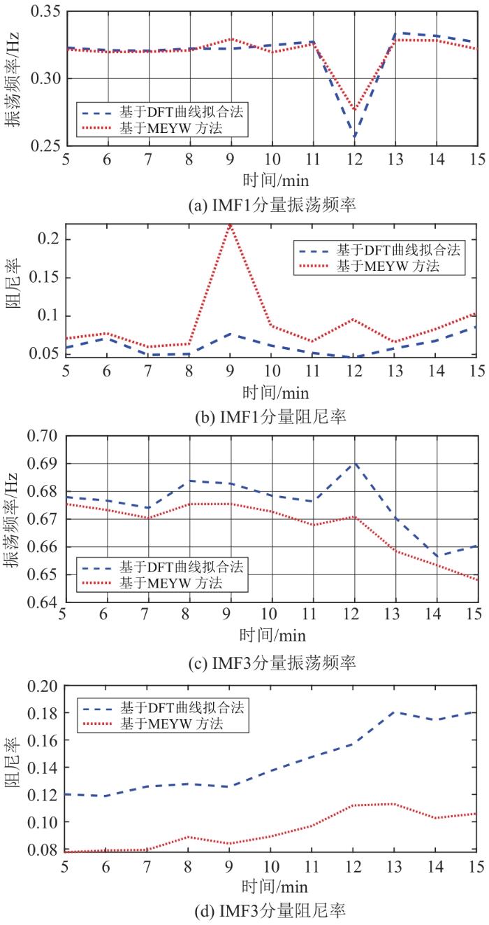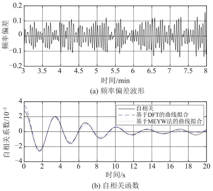 本文采用VMD分解滤除原始数据中的直流分量,并提取出系统低频振荡信号,然后做自相关计算消除噪声,低频振荡参数由自相关函数的拉普拉斯变换计算得到,而拉普拉斯变换式(22)的系数通过信号自相关函数DFT的曲线拟合来估计,最后由ARMA模型产生的类似真实PMU的频率数据和实测PMU频率数据验证方法的有效性和准确性。