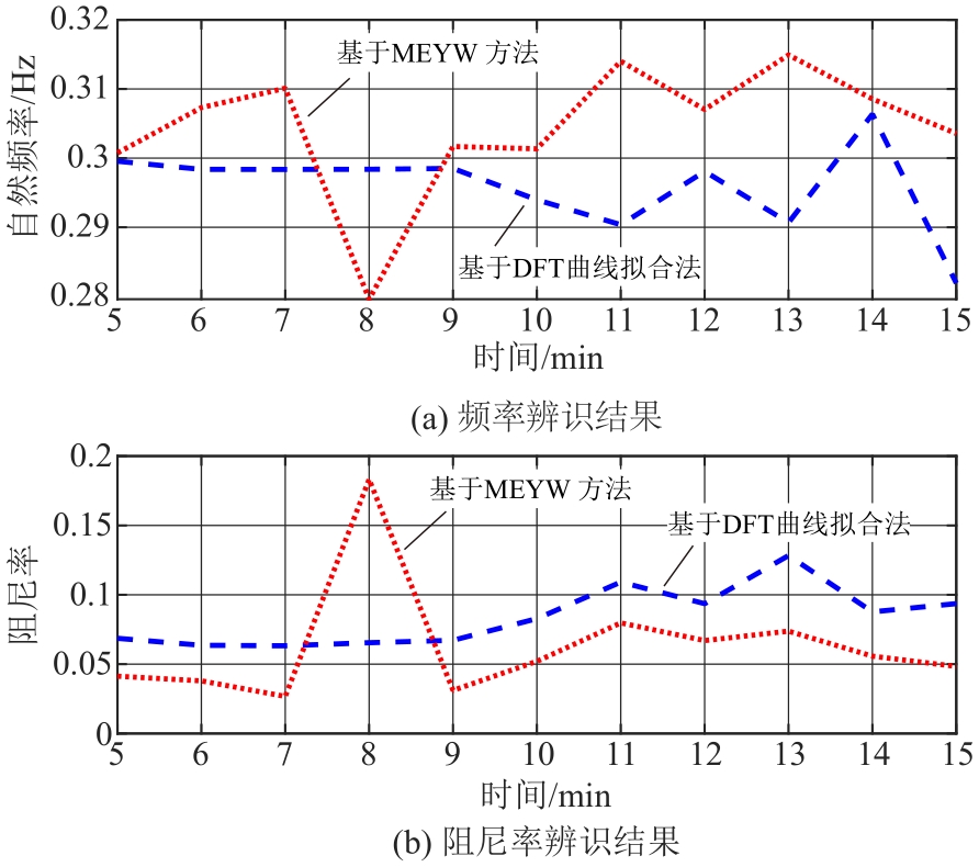 | 图5 模拟数据 IMF1频率和阻尼率的辨识结果 |