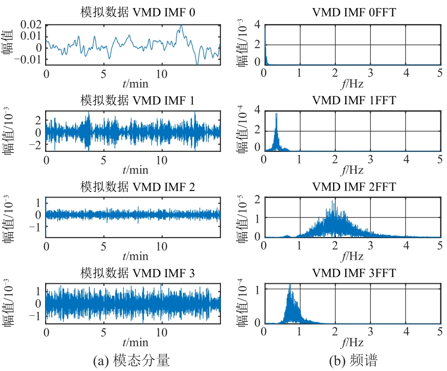 | 图8 某电网实测频率数据的模态分量及频谱 |