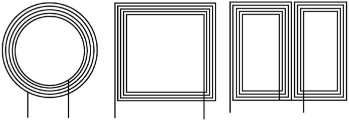 在线圈的传输过程中,由于漏磁的存在,会导致传输效率的下降。通常在线圈中加入铁氧体材料,来约束传输线圈之间的磁路路径,提高线圈之间的耦合系数。常见的线圈有圆形、矩形、双D形,如图1所示。