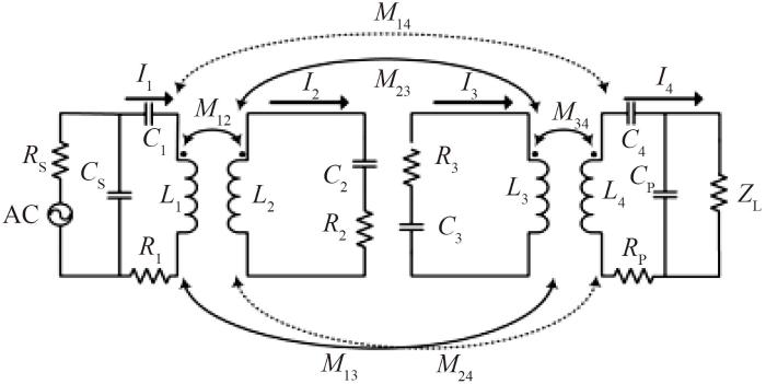 电力巡检机器人无线充电系统采用动态无线充电方式,其中的一种结构是将传统的两线圈式改造为四线圈式,即在发射线圈和接收线圈之间加入了2个中继线圈,增加传输距离,如图8所示。