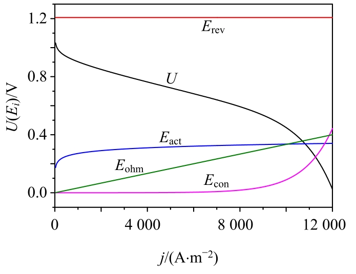 图2 Erev, Econ, Eact, Eohm, U随j变化曲线 |