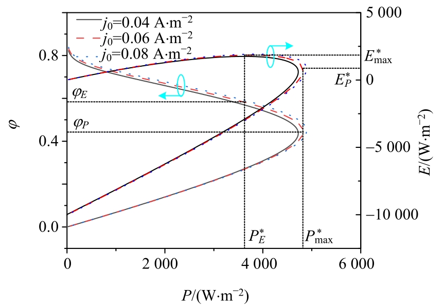 图11 交换电流密度j0对输出功率密度、?效率和生态函数密度的影响 |