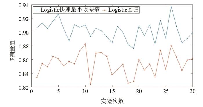 对2种算法分别进行30次预测,图1 是2种算法预测结果的F测量评价。从图1 中可以看出,2种算法的F测量值都在0.80以上,但Logistic快速最小误差熵的预测效果要明显好于Logistic回归的效果。