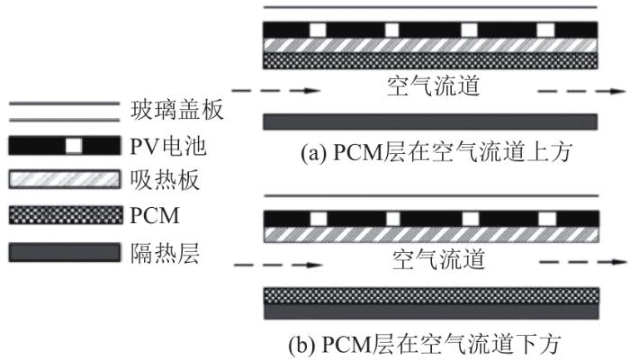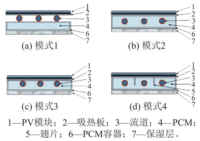 ... 图8为PCM在空气式PV/T集热器中的典型配置[7],根据PCM层在空气流道的上方和下方可分成2种类型.而PCM与液体式PV/T模块的集成主要有4种混合设计模式[50],如图9所示.其中:模式1是PCM层位于冷却管道上方;模式2是PCM嵌入到冷却管道中;模式3是PCM嵌入到冷却管道中,并且冷却管道直接和吸热板接触;模式4加入了从容器壁突出到PCM的翅片,这样,吸热板的表面被扩展,从而改善了向相变材料的传热.但这种设计的缺陷是系统重量因金属翅片的加入而增加,并且光伏板背面无翅片部分会出现温度不均匀分布.尽管如此,在PCM中插入金属翅片仍是对PV/T-PCM系统进行热管理的常见方式. ...