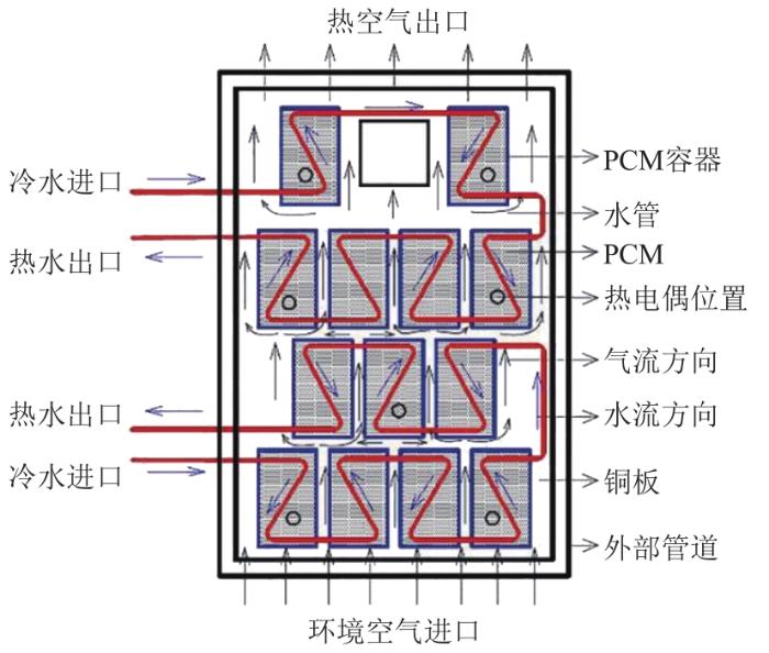 ... 除在PCM层中加入金属翅片外,还可以通过改变管道布局增强热量传递,如Hossain等[51]提出了一种基于两侧蛇形流道的PV/T-PCM系统,如图10所示,以使PV面板可以受到更均匀的冷却.Navakrishnan等[52]选用双流体式(水和空气冷却)PV/T集热器,将水管以锯齿状排列,以最大限度地从容器中传递热量,系统结构如图11所示. ...