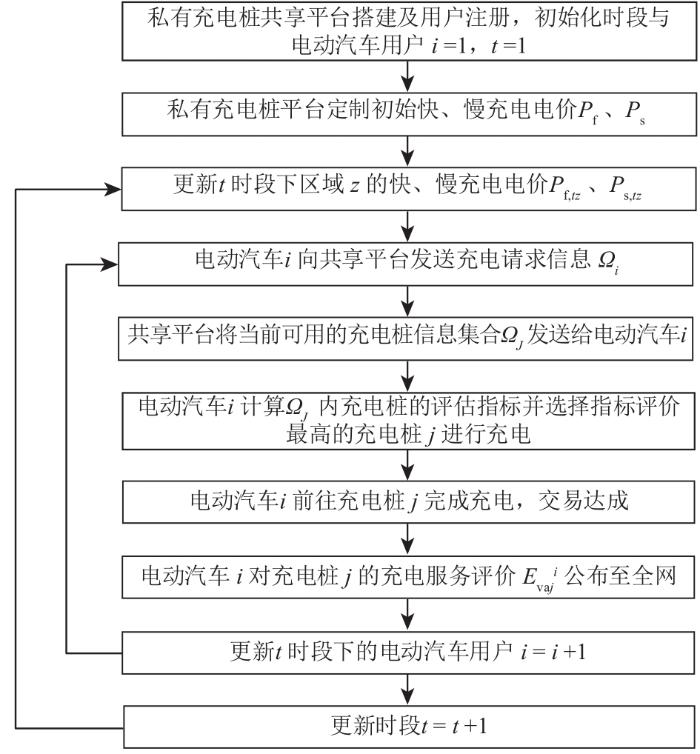 电动汽车在私有充电桩共享平台中的充电交易流程可理解为,电动汽车在私有充电桩形成的高密度充电网络中的充电交易过程。整个充电交易过程受到充电桩主人和电动汽车用户2个方面的影响,例如私有充电桩的定价、电动汽车用户对各个私有充电桩以及公共充电桩的选择决策等。私有充电桩共享平台电力交易流程如图2所示。