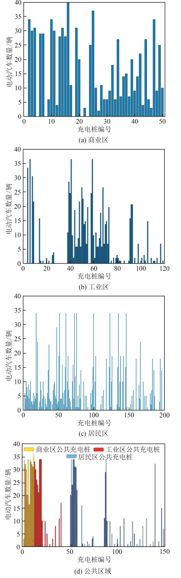 从表4可知,具有充电需求的4 298辆电动汽车中共有2 328辆选择了私有充电桩进行充电,私有充电桩共享平台为52%有充电需求的电动汽车提供充电选择以满足其充电需求。仿真结果表明:私有充电桩分散、闲置时间长的特点,可有效弥补公共充电桩数量较少、分布较集中的缺点。