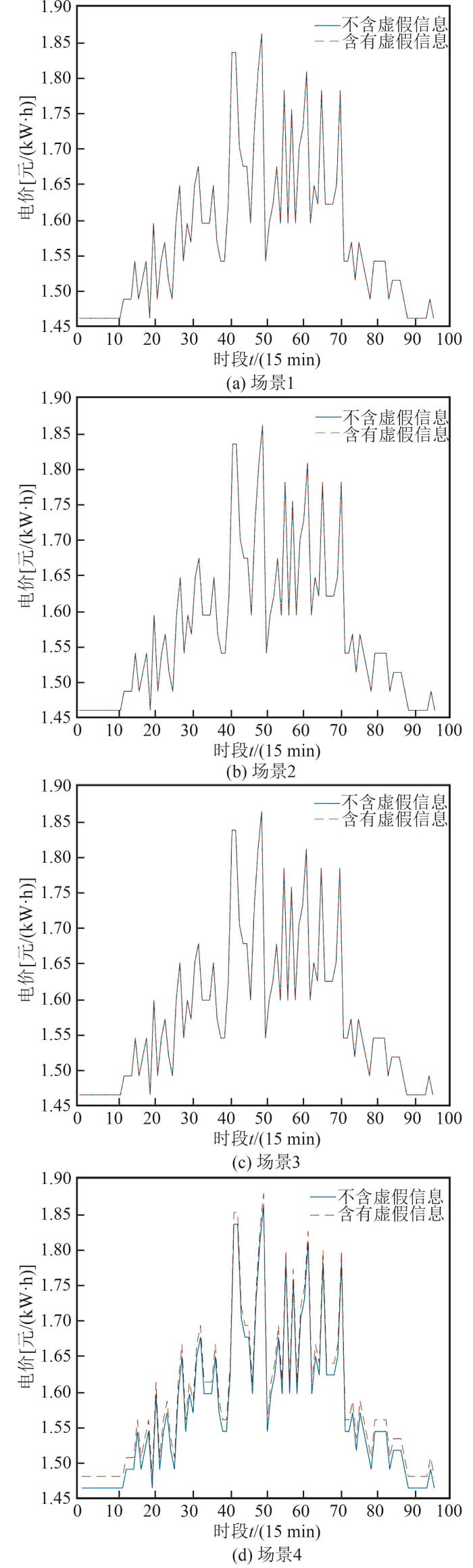 为了验证本文提出的DPOS共识机制对虚假信息防范的有效性,算例设置了15个代表节点,并且考虑了以下4个场景:1)系统中不存在恶意代表节点;2)系统中存在1个恶意代表节点;3)系统中存在5个恶意代表节点;4)系统中存在8个恶意代表节点。以区域4中的动态快充电价为例,不同场景下考虑私有充电桩传递虚假信息时的动态电价如图10所示。其中,虚假信息情况为:区域4中各时段的充电次数均向上虚报了10次。