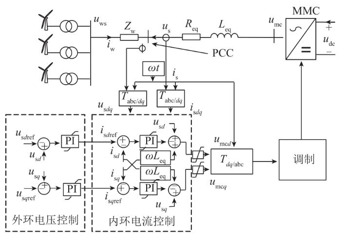 图2中:uws为风电并网点电压;iw为风电线路电流;Zw为风电并网点至公共连接点(point of common coupling,PCC)点线路阻抗;udc为直流电压;umc为MMC输出电压;us为PCC点电压;is为MMC输入电流;ω为系统频率;Leq为MMC等值电抗;Req为等值电阻;Tabc/dq 和Tdq/abc为坐标系变换;下标d、q表示在dq坐标系下的分量,下标ref表示相应变量参考值。在dq坐标系下,换流器外环功率控制器的数学模型表示如下: