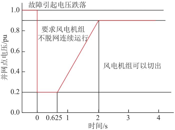 根据GB/T 19963—2011《风电场接入电力系统技术规定》第9条,风电场并网点电压跌至20%标称电压时,风电场内的风电机组应保证不脱网连续运行625 ms,且电压跌落2 s内能恢复到标称电压的90%时,风电场内的风电机组应保证不脱网连续运行,如图3所示。标准还规定了风电场低压穿越过程中应具备动态无功支撑能力,当风电场并网点电压处于标称电压的20%~90%时,风电场应能够注入无功电流以支撑电压恢复,风电场注入系统的动态无功电流IT应满足关系: