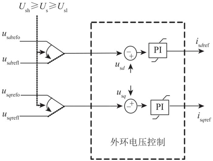 本文提出控制策略如下:设定交流电压Us的上、下限分别为Ush、Usl,当电压恢复至Us≥Usl时,切换柔直交流电压参考值为usrefl;当电压恢复至Us≥Ush时,恢复柔直交流电压参考值为故障前的usrefo。图5为暂态过电压辅助控制策略框图。