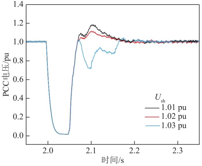 进一步地,针对控制策略中参数变化对控制效果产生的影响进行了仿真分析。其他参数不变,改变策略退出电压上限Ush,仿真结果如图10所示,可以看出,电压上限Ush越高,策略生效时间越长,PCC点电压能达到的峰值越小,当Ush=1.03 pu时,由于PCC点电压在策略生效期间无法超过电压上限,不能自行退出策略,直到最大生效时间0.1 s后才退出抑制策略,导致PCC点电压的再次下降,与预期分析一致。