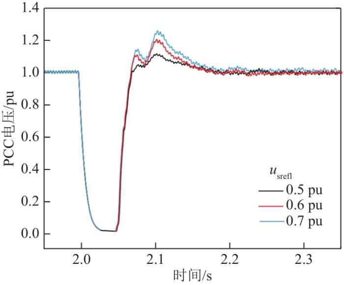 保持其他参数不变,改变策略生效期间的电压参考值usrefl,仿真结果如图12所示,可以看出,电压参考值usrefl越大,电压上升的速度越快,PCC点电压能达到的峰值越大,策略的暂态过电压抑制效果越差,与预期分析一致。