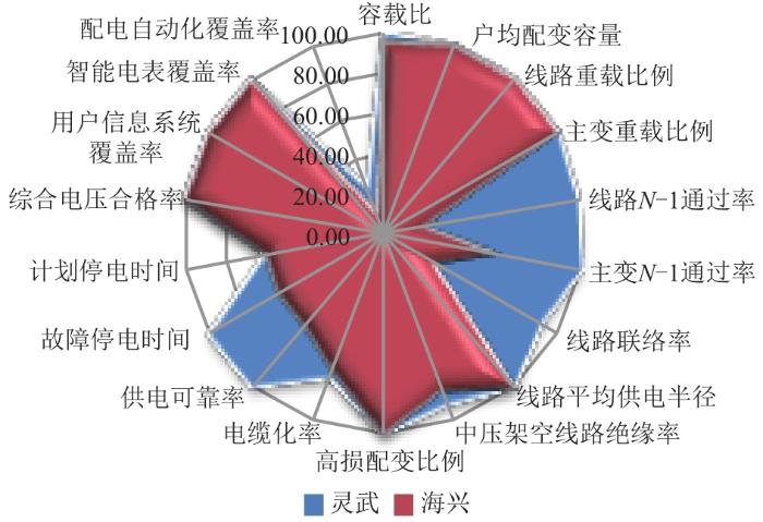 表4中数据表示的是导致其他供电公司与灵武市供电公司差异来源的占比情况。以海兴供电公司为例,导致两者差异的主要来源是电网发展评价结果,占比为80.99%。因此需要对灵武市和海兴的电网发展维度指标进行深入分析,同时考虑18个县域的平均水平。本文主要从指标偏差
