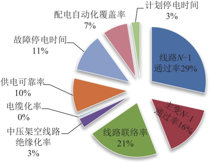 从图5可以看出,导致海兴供电公司和灵武市供电公司电网发展维度指标偏差的主要原因是5个指标,包括供电可靠率(16%)、线路N-1通过率(26%)、线路联络率(20%)、主变N-1通过率(15%)、故障停电时间(14%)。