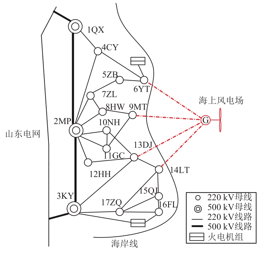 | Fig. 1 Wiring diagram of eastern Shandong coastal power grid |