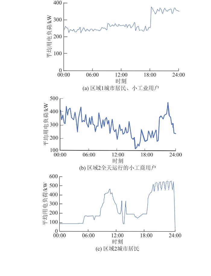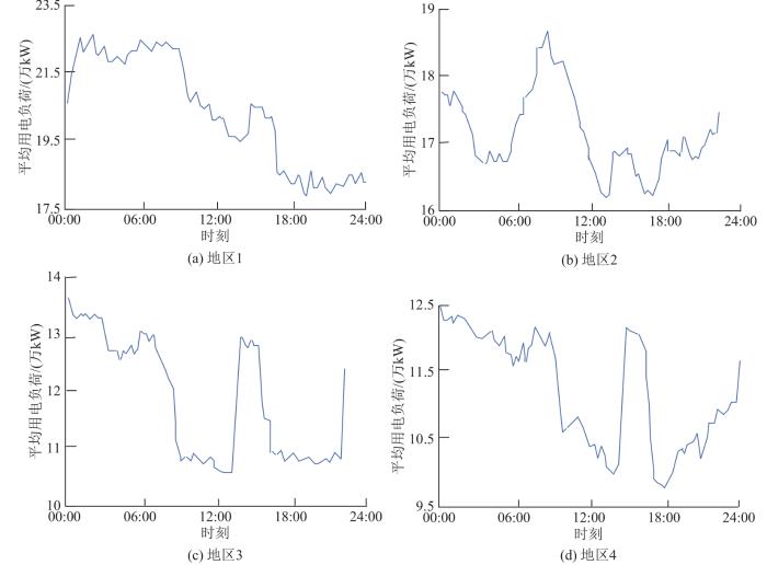 根据某区域2020年12月各地区电热日负荷数据(以用电采集系统每日96点数据为准,覆盖所有建档的电热负荷专用表计),选取负荷最大的4个地区来分析,如图2 所示,电热负荷均呈类似特性,谷段(23:00—次日09:00,14:00—16:00)负荷较大,平段负荷较小,峰谷差一般为10%~20%。