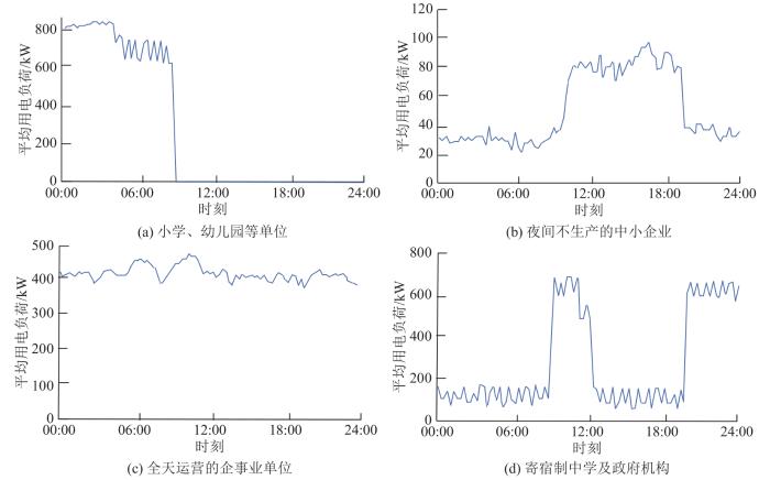 从不同行业角度来看,集中式电热负荷受价格、用户习惯及温差等多重因素影响,主要呈现4种典型特性,如图3 所示。学校、幼儿园等单位一般采用蓄热式供暖,低谷蓄满,高峰释放;夜间不生产的中小企业采用直热式供暖,白天集中供热,晚上停用,晚高峰基本无调节空间;24 h生产运行的企事业单位采用直热式供暖,用电负荷曲线全天基本保持平稳,但晚高峰期间仍有一定调节空间;寄宿中学及政府机构同样采用直热式供暖,但早晚高峰用能明显较大,晚高峰期间调节空间充足。