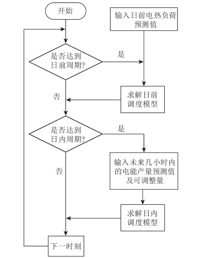 电热负荷柔性调度包括日前调度和日内调度。其中,日前调度应先判段当前是否达到日前调度周期,若达到,需输入日前电热负荷预测值,以此来求解日前调度模型,制定调度计划,确定当前大工业负荷的可转移量、可平移量和可削减量。