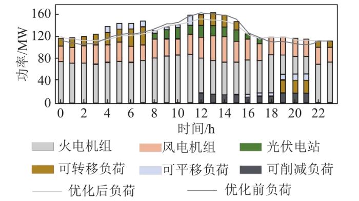 日前调度策略主要是靠改变机组的启停状态来改变机组的电量输出。日前调度前后电热负荷平衡出力对比及柔性电热负荷响应分别如图6 、7 所示。可以看出,柔性电热负荷参与调度前,负荷的峰谷差为51.36 MW,加入柔性电热负荷后,峰谷差降为32.8 MW,比调度优化前降低了约36.12%,可平移负荷和可削减负荷在降低峰谷差方面起主要作用,表明日前调度策略中加入柔性电热负荷可有效降低负荷峰谷差,改善用电质量。