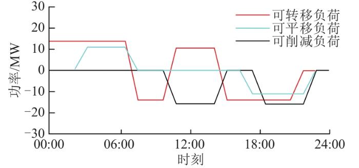 其中:可转移负荷是指在调度期间,用户通过改变其生产生活方式,将某一时刻的部分负荷转移到另一时刻,总负荷不发生改变;可平移负荷是指在调度前一天对负荷进行预测,在不改变系统整体负荷的情况下实现调峰处理;可削减负荷是指在调度过程中具有削峰能力的负荷。三者统称为柔性负荷。