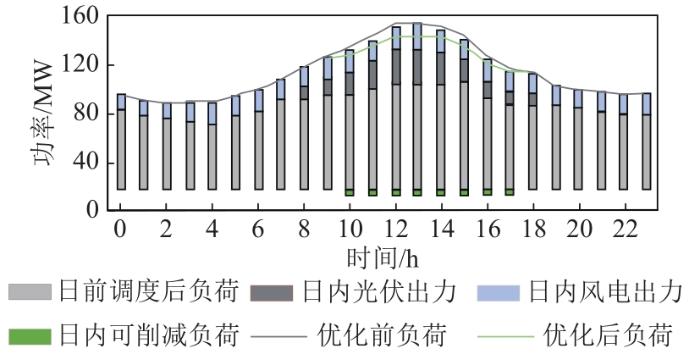 日内调度前后电热负荷平衡出力对比及柔性电热负荷响应如图8 、9 所示。可以看出,日内调度优化前,电热负荷峰谷差约为75.47 MW,日内调度优化后,峰谷差降为59.24 MW,比调度优化前降低了约21.51%。在日内调度过程中,只有可削减电热负荷出力,分析结果表明,日内调度优化也可以有效调整电热负荷峰谷差,实现对负荷的柔性调节。