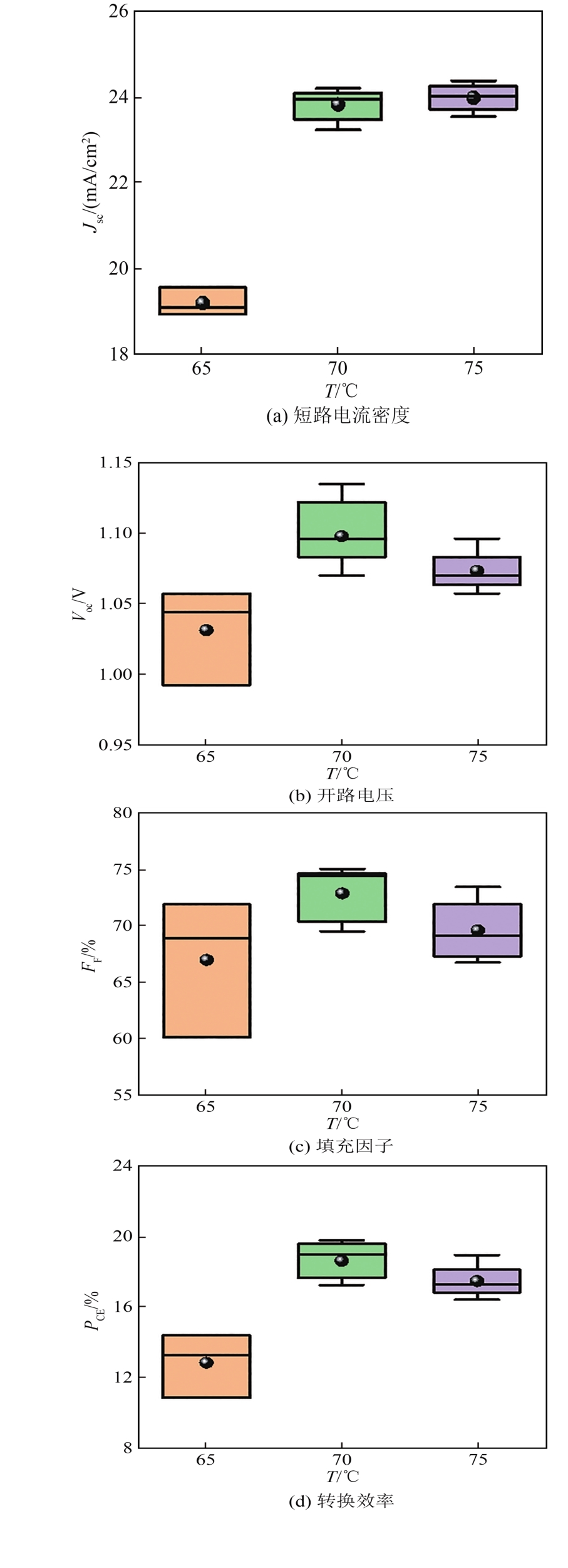 | 图4 不同PbI2退火温度下电池性能参数箱式分布图 |