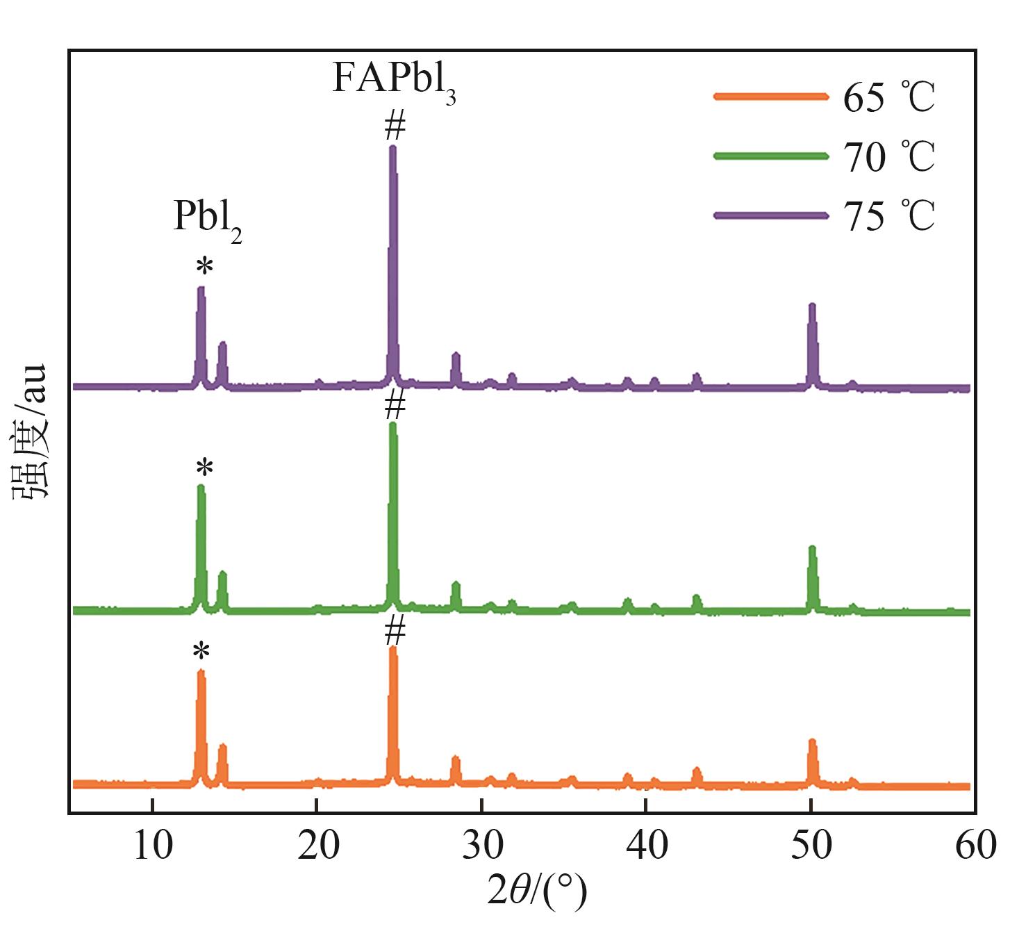 | 图8 不同PbI2退火温度下制备钙钛矿层的XRD图 |