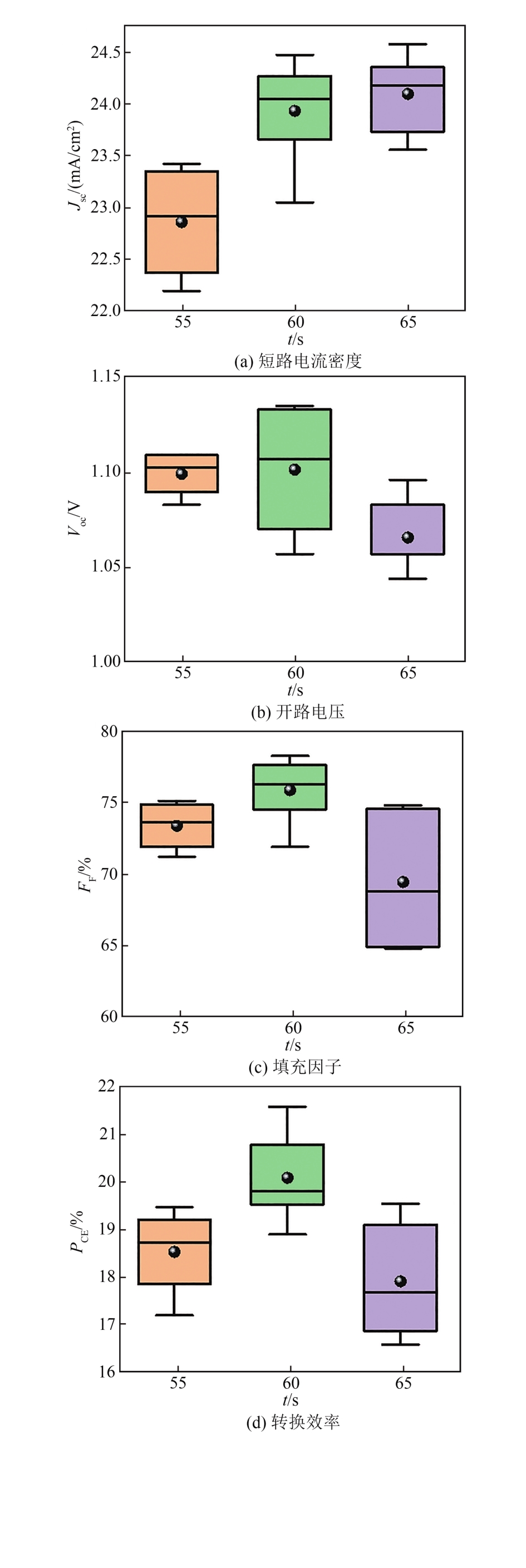 | 图9 退火温度为70 ℃时,不同PbI2退火时间下的电池性能参数箱式分布图 |