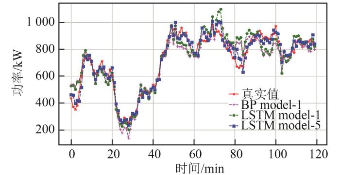 表3为风电机组理论发电功率估算模型的测试集误差,可知本文提出的考虑历史时刻风速的LSTM单机理论发电功率估算模型(LSTM model-5)的估算误差最低,相比于不考虑历史时刻风速的模型均方根误差下降了45%。而不考虑历史风速的LSTM和BP单机理论功率估算模型(LSTM model-1和BP model-1)的均方根误差和平均绝对误差都较为接近,且均大于LSTM model-5模型。