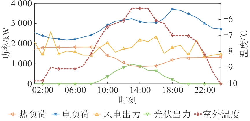 | 图3 电热负荷、风光出力及室外温度情况 |