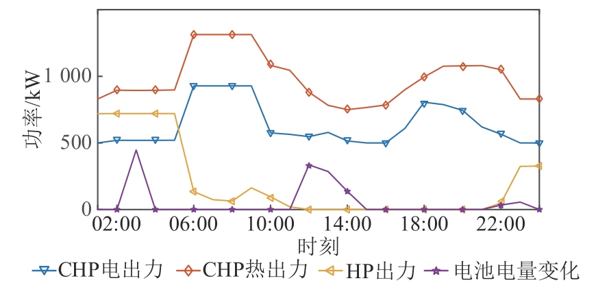 | 图5 基于分布鲁棒优化的CHP、HP和电池出力情况 |